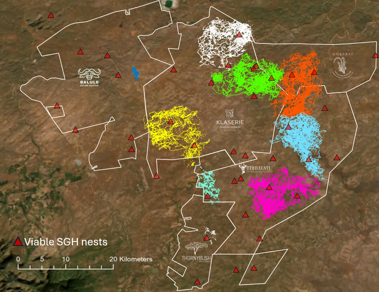 The first tracker was fitted onto a chick in March 2025. This chick subsequently fledged the nest 15 March 2025. Since then, a total of 9 trackers were deployed. Of these, 6 birds are currently still transmitting data regularly, although the team suspects that there may be an additional one that is currently in KNP and thus out of range of the receivers installed in the APNR.