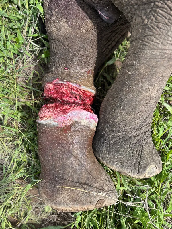 An elephant calf was seen with a snare around its left hind limb. Both the calf and the mother had to be immobilised to remove the snare. It was made of cable and had cut very deeply. Despite the seriousness of the wound we expect a full recovery. The operation proceeded smoothly and without complications. Samples for bacterial culture were taken from the snare wound, as a study about antibiotic resistance is currently being done.