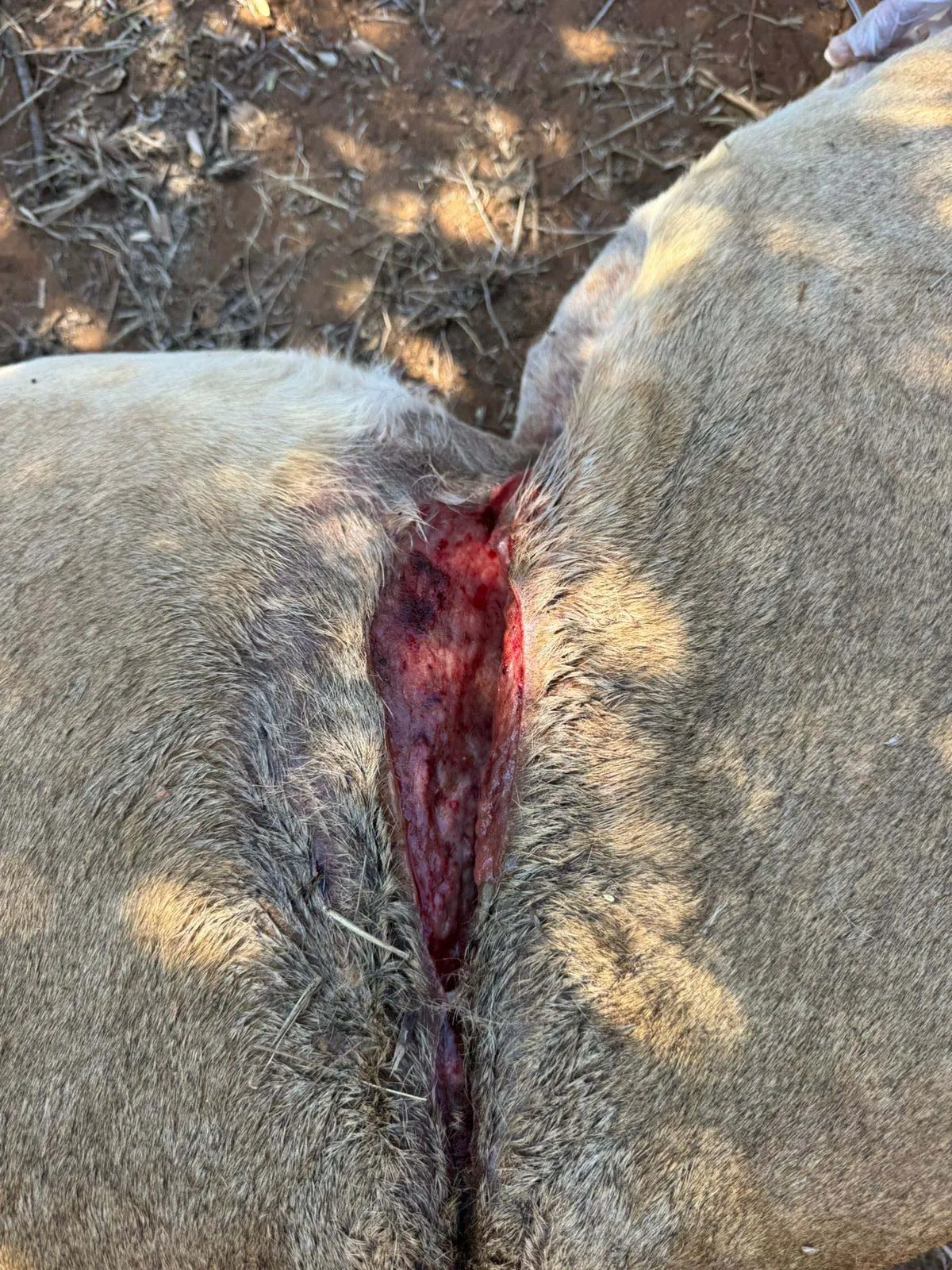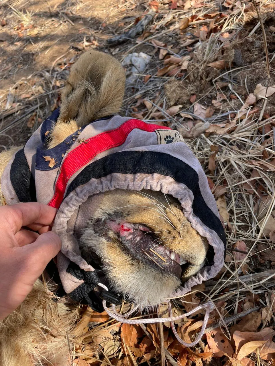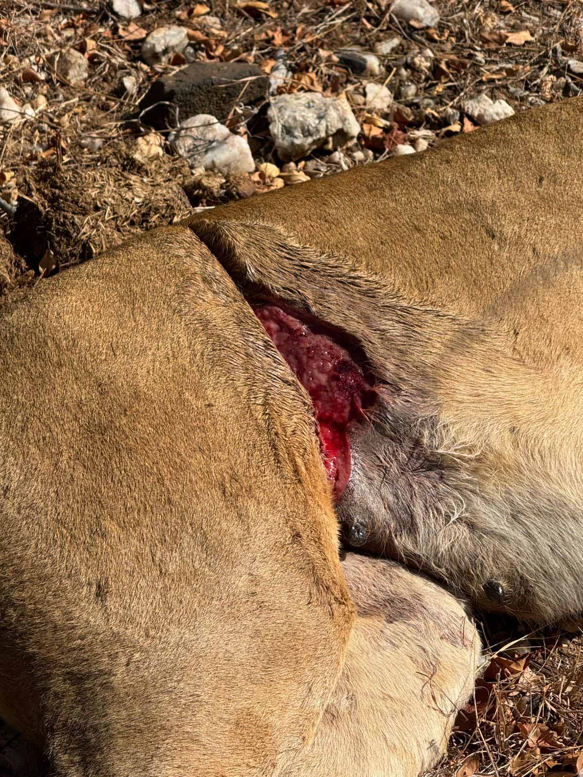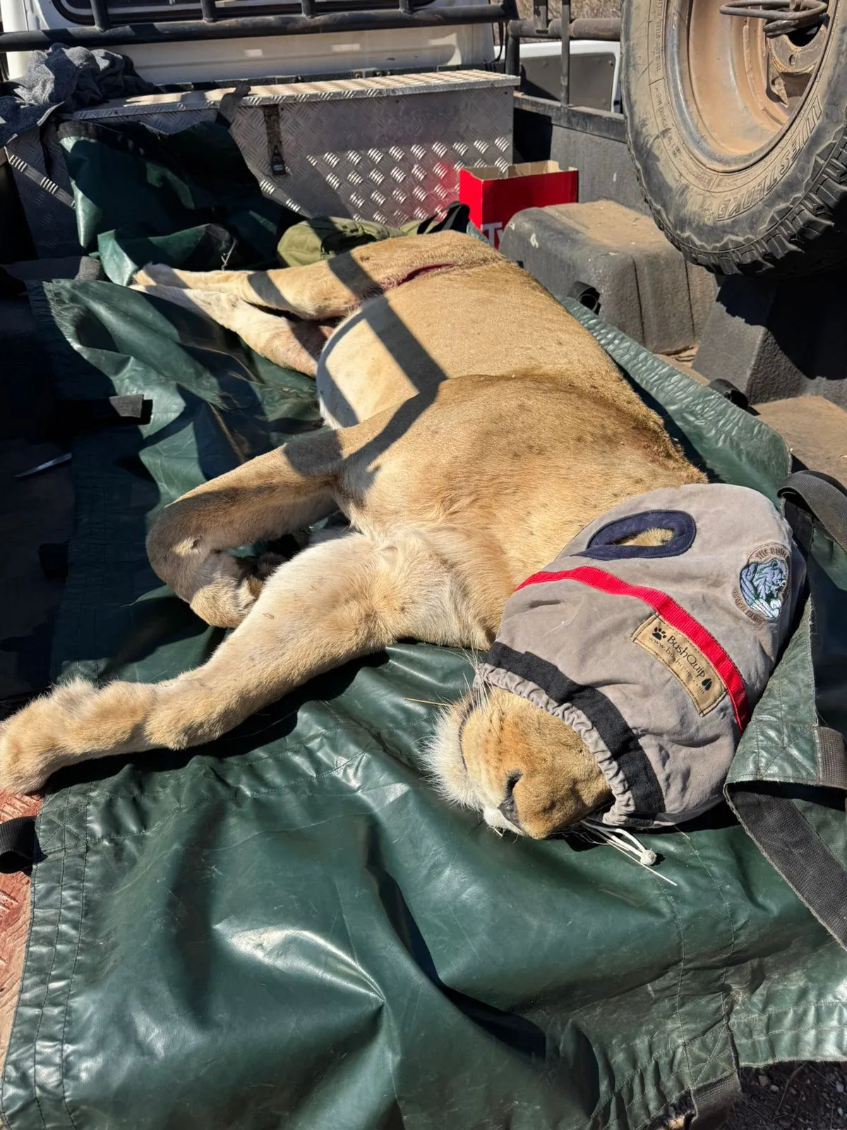 The next day, again the pride did not approach the bait and decided to hide in the hills. On day three of trying, the team decided to just try and drive up to them as close as possible. This did the trick and the vet managed to dart the lioness with the most severe wound around her abdomen. The snare was cut, the wound was treated and lioness was given pain medication. Because she was in good body condition, we are quite confident that she would make a full recovery. We suspected another 1 or 2 lions with snares in the pride but as we darted to female, the cubs unfortunately ran ahead and were out of reach. After treating the female we placed her next to the bait for the wake up, hoping she would call the others down the mountain. Unfortunately she enjoyed her alone time a little bit too much and ate the bait without calling the others.