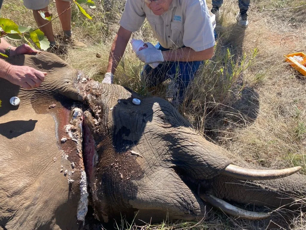 The elephant was darted from the helicopter and showed signs of the tranquiliser working within around 8 minutes. The pilot moved the rest of the elephant herd off a short distance to give the veterinary team a safe area to work on calf. The thick cable wire was embedded in the elephants neck so the vet first cut it off with wire cutters before attending to the severe wound - flushing it out and cleaning it intensively. Antisepetic and antibiotics were administered, before injecting a reversal drug to wake the young elephant up. The helicopter monitored the elephants for a short while from above to ensure the calf reunited with the herd, which it did successfully.