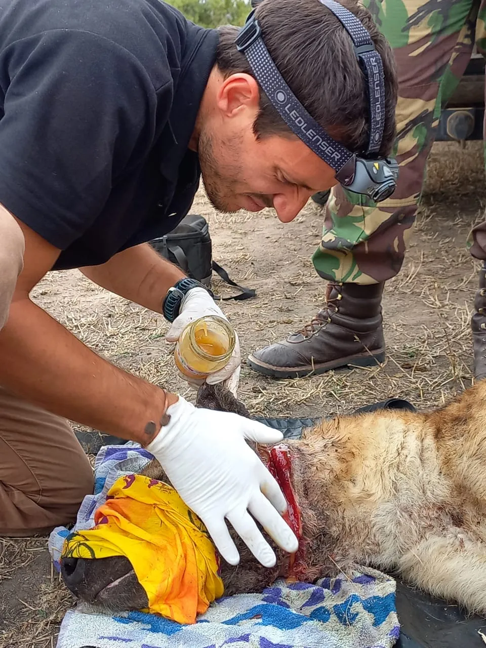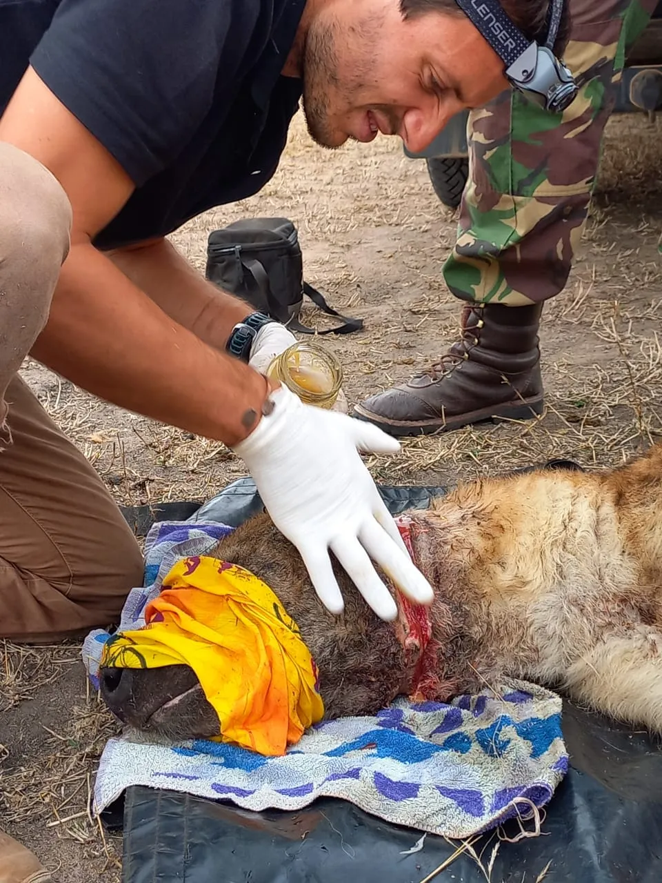 Joel managed to dart the hyena with a tranquilliser and then together we managed to pull the poor animal out of the pipe and onto a canvas stretcher so we could assess the snare and subsequent damage. The hyena had a cable snare all the way around its neck which had definitely affected the animals food intake and it was in very poor condition. We removed the snare from its neck and cleaned and treated the deep wound that had formed as a result of the snare. Joel covered the wound in a thick smothering of honey (Elephants Alive natural wild honey) as this natural product is a fantastic healing agent. He also set up a drip during this time to get some fluilds into the hyena.