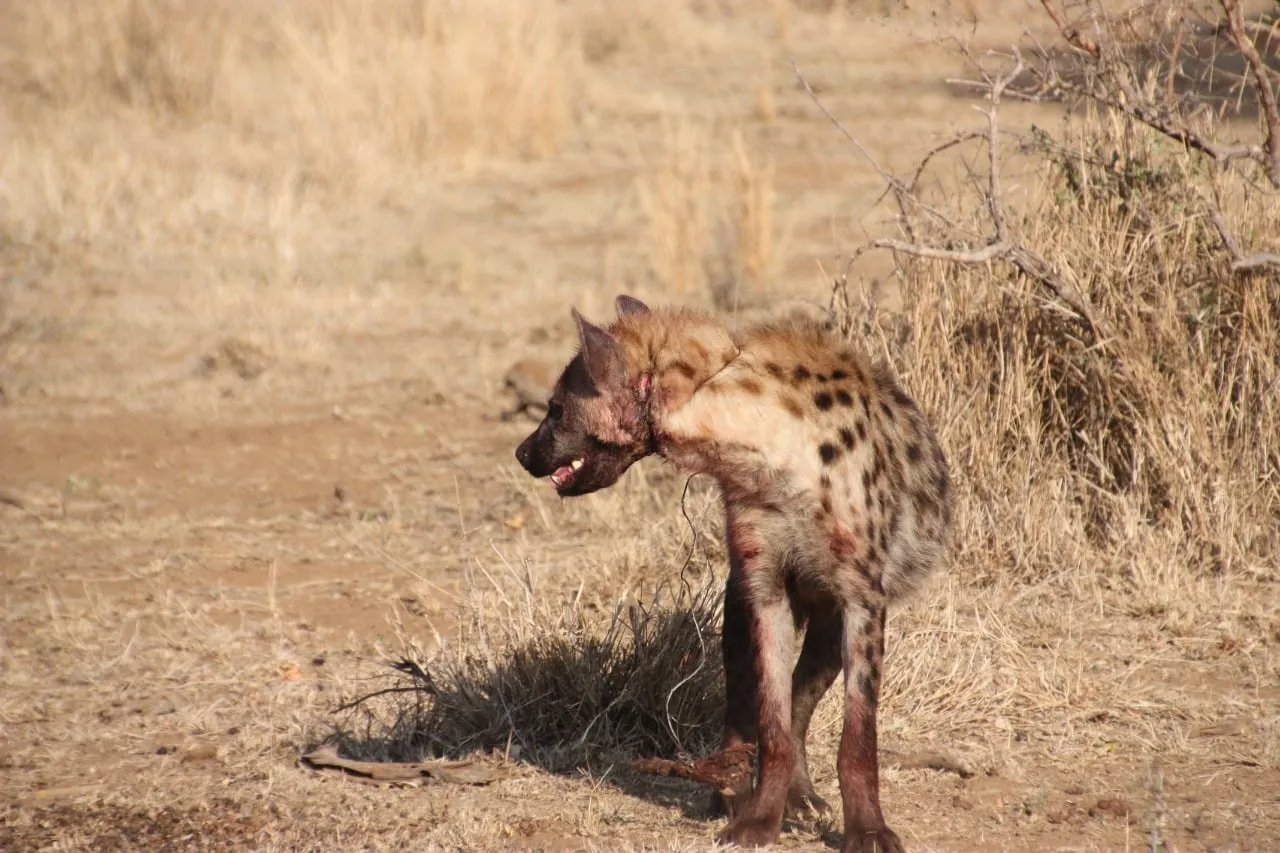 The snare around the hyena’s neck was still attached to a large, heavy branch, which the hyena had taken to carrying in it’s mouth to prevent the cable pulling tighter around its neck (heart-breaking, but incredible). As the hyena moved toward the impala carcass, it saw the other hyenas and moved off a little bit into thicker bush. The vet followed the snared hyena off-road with the vehicle and darted the hyena. The snare was successfully removed, the wound cleaned and treated with honey (a natural anti-biotic) and an additional anti-biotic injected due to the severity of the wound.