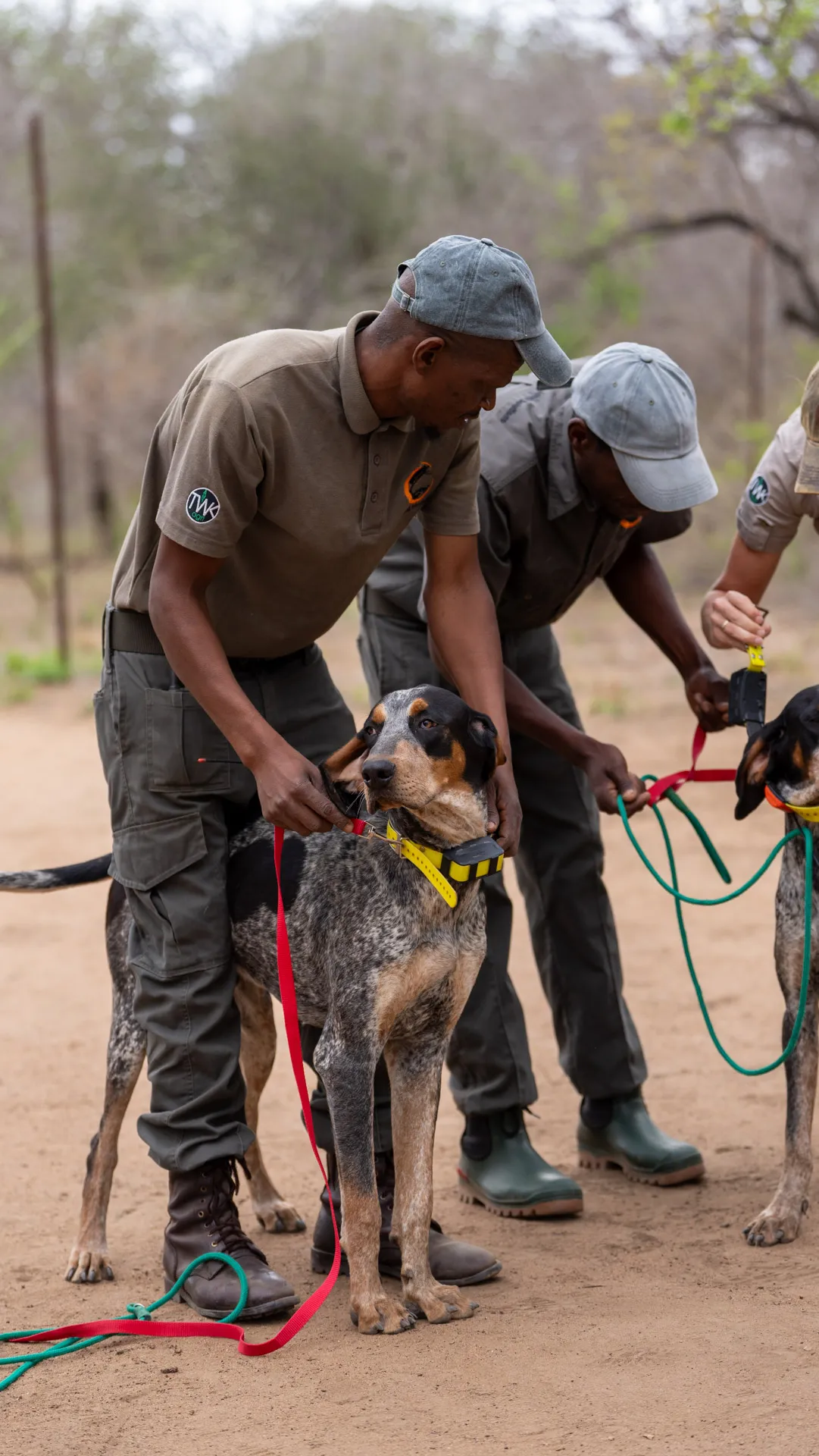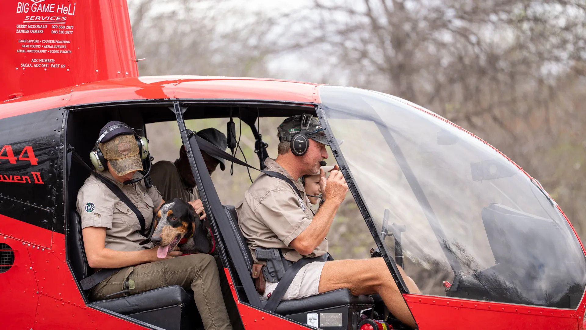 Anti-poaching pack hounds track suspected poachers at breakneck speed through the bush. They are deployed off-line (meaning off-leash), and in order to keep track of the hounds - a helicopter is needed. As and when the dogs apprehend the suspected poachers, they are then returned to base with the helicopter.