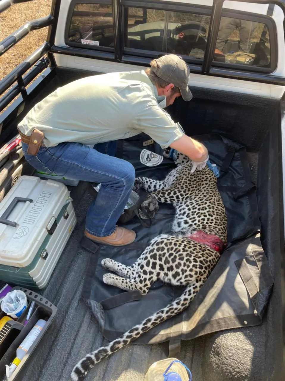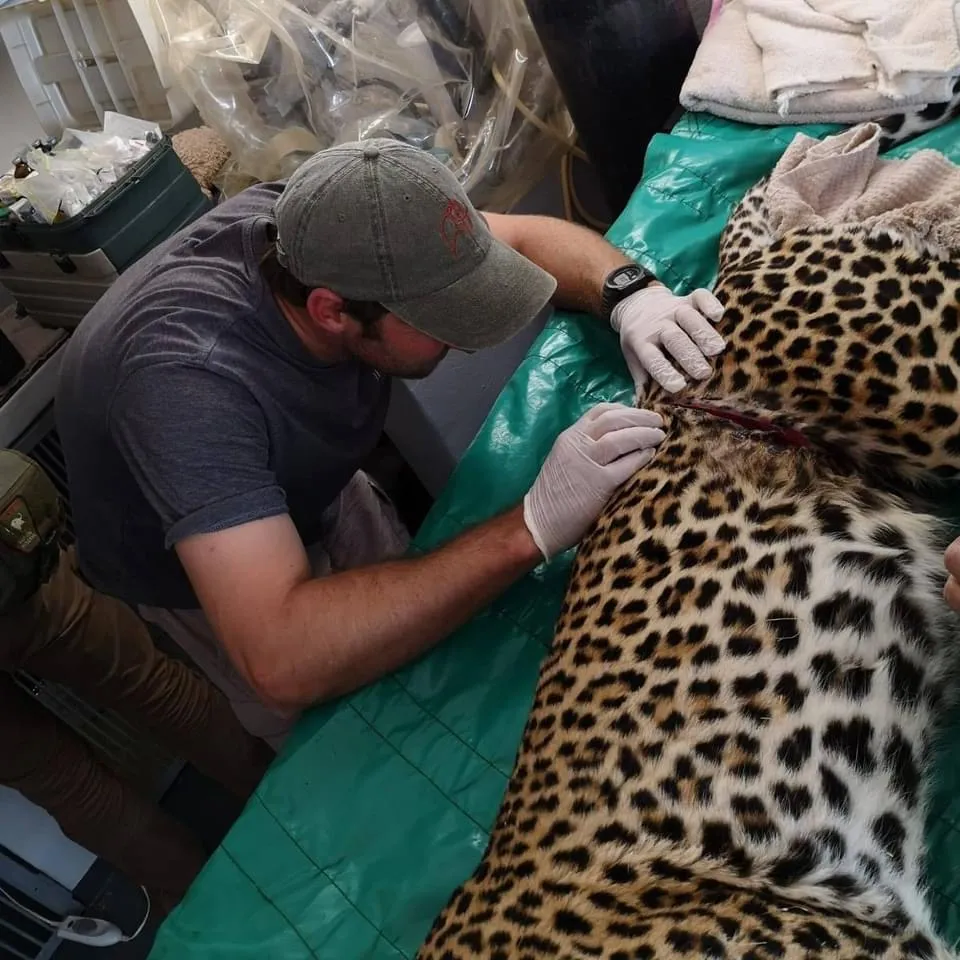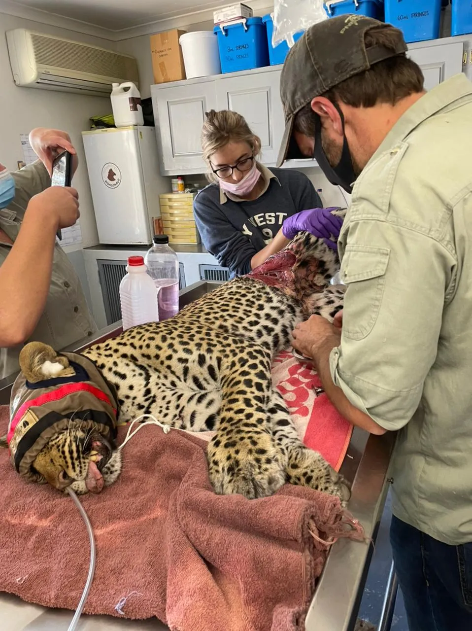 The leopard was cut free from the snare but due to the severity of her wounds, she was rushed straight into a veterinary practise for surgery. She had snares both around her paw and her abdomen, the latter being in an extremely critical spot. Skilled vets Joel Alves and Ben Muller from WildScapes operated to clean the wounds and stitch her up. Concern was raised over the abdomen wound which had cut in deeply, acutely damaging her kidneys and ovaries.
