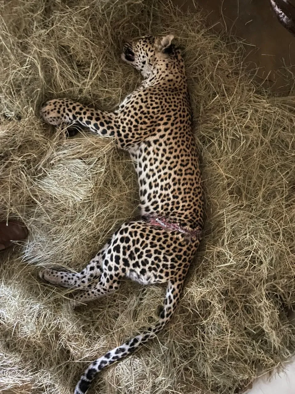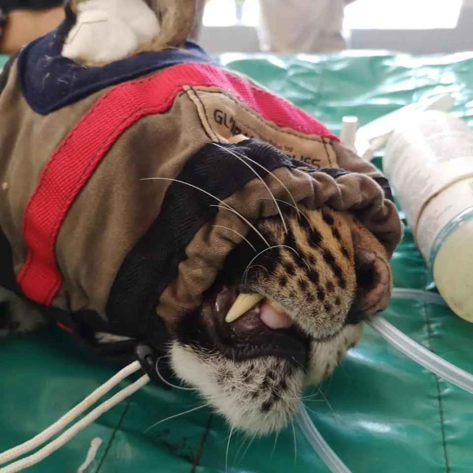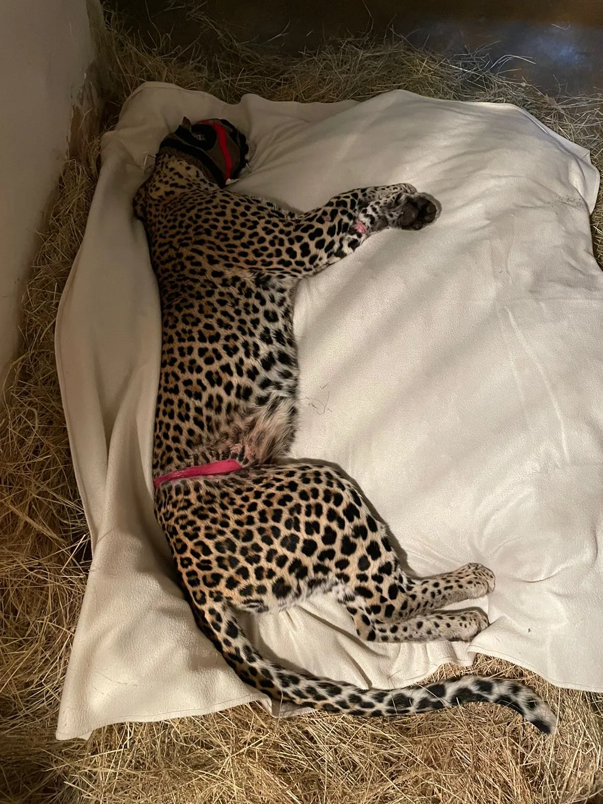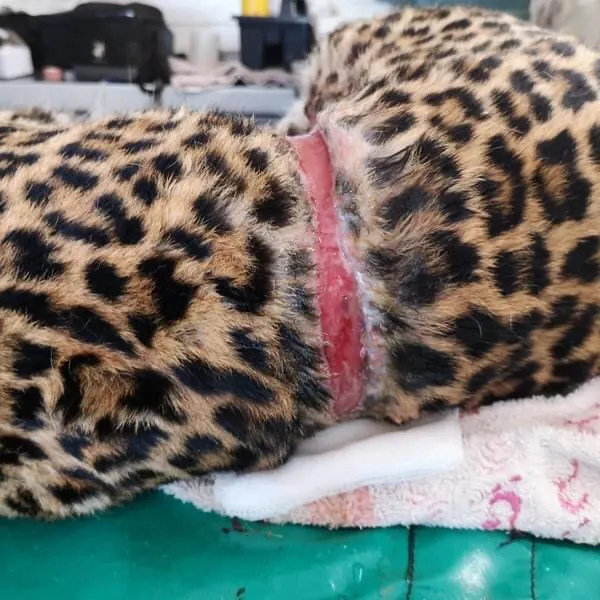 Post operation, the leopard was taken to Moholoholo Rehabilitation Centre for recovery and round the clock supervision. Luckily she made it through the first nights and was eating meat with medication inside to help reduce inflammation. At Moholoholo, she received frequent check-ups and 2 weeks after the first surgery was immobilized by the vets to assess her condition. Her wounds looked great, and it was reported that she is eating very well. There was some concern about her kidney function as her kidneys were acutely damaged in the incident but the vets are happy with her progress and reported that her kidney function is improving.