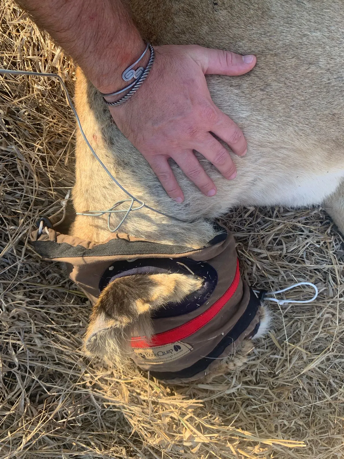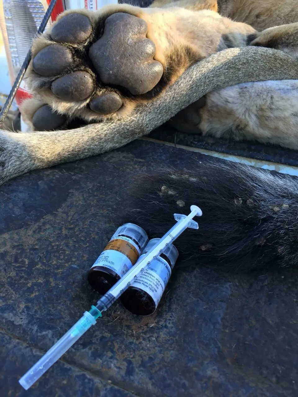 The lioness was darted from a vehicle and sedated to enable the WildScapes Vet, Dr Ben Muller to remove the snare & treat a wound on her paw that likely resulted from her trying to get rid of the snare herself.