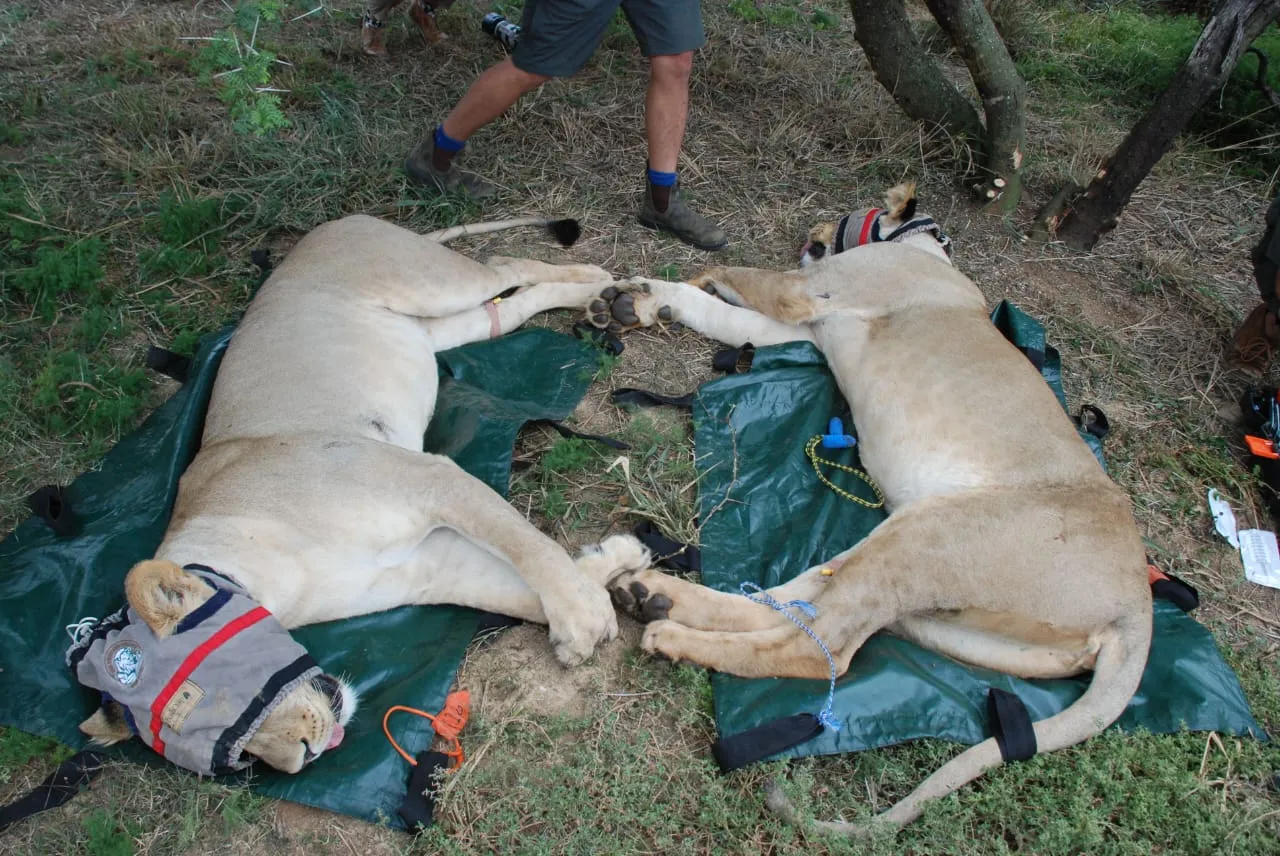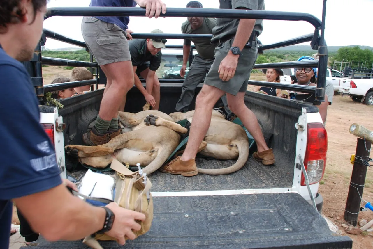 After carefully manoeuvring the lionesses out of the aircraft, they were loaded for the final leg of their journey to the bomas within Addo Park. There, one of the lionesses was fitted with a GPS collar for monitoring purposes. The team captured identification photos of the animals, and alongside Dr. David Zimmerman, the reversal agents were administered to wake the lionesses. Both had a smooth recovery and will be closely monitored by the SAN-Parks team.