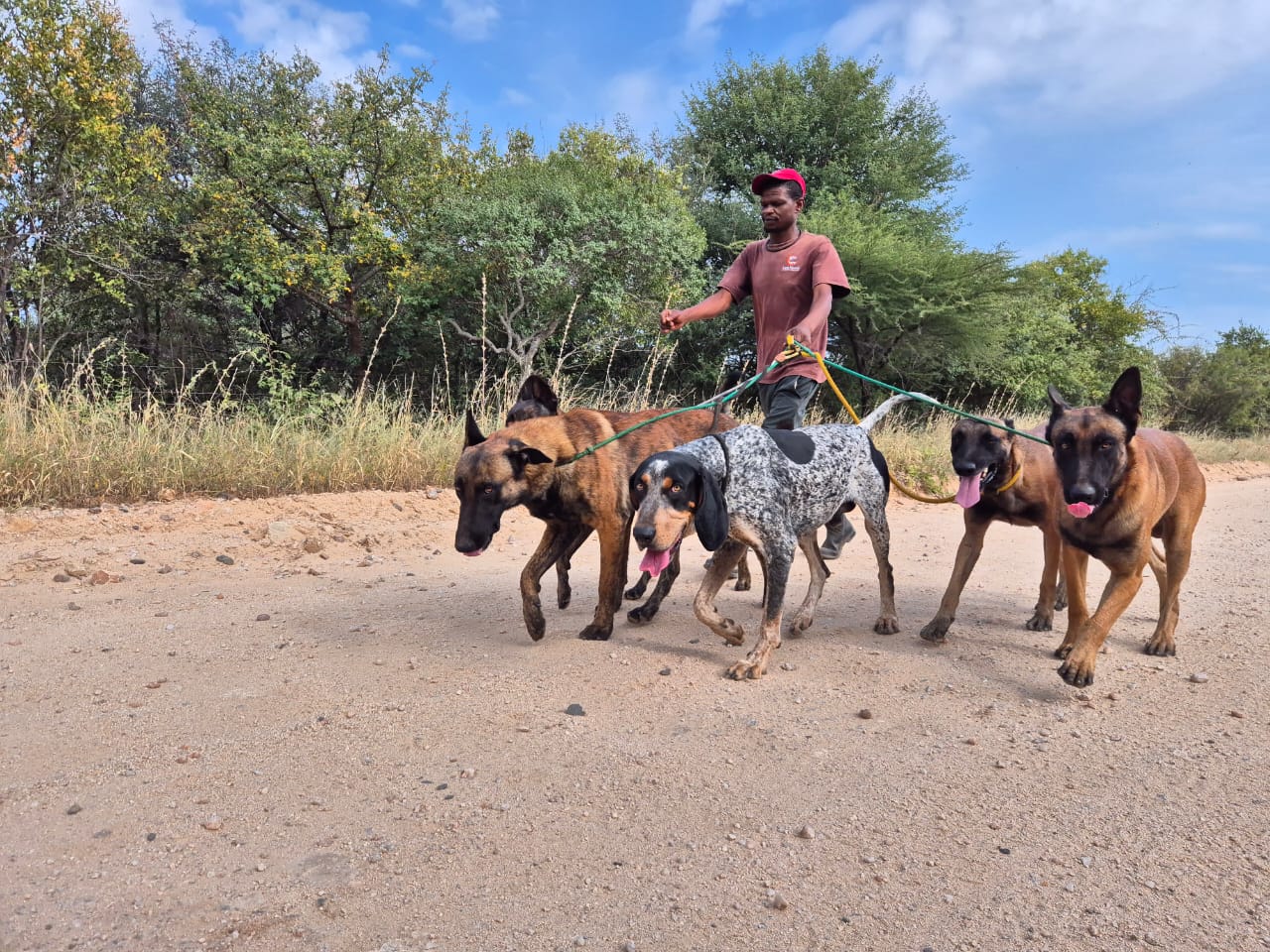 Once a suspected poacher or poaching incident is detected (either through ground or areal patrols, or using AI & drone technology), the pack hounds are deployed, 'off-line' - meaning off-leash - at the start of the track (or 'spoor' in Afrikaans). The hounds then work together to track the 'spoor' of the poachers, using their extraordinary sense of smell and prey drives. Being 'off-line' means that they can move freer and faster than on-line single tracking dogs, who have to move at the pace of the handler.