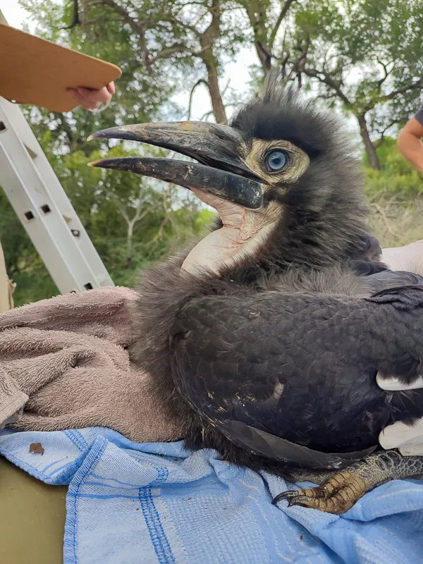 The project has successfully reversed the decline of this keystone species in South Africa’s Kruger Park. Today, the project actively monitors 36 known nesting sites within the APNR (5 natural; 31 artificial). Since the project began in 2000, a total of 173 Ground-Hornbill chicks have successfully fledged from nests in the APNR. 143 (!) of these chicks originated from artificial nests installed by the project.