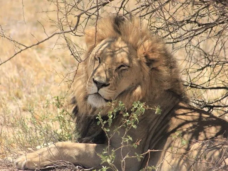 A future ‘Star Wars’ movie title, perhaps? We did indeed feel like we were part of a movie for moments during the days drive, as we passed through truly spectacular scenery. There are considerably more animals in the northern parts of the CKGR and we enjoyed seeing large herds of Springbok, Gembsbok, at least 10 Kori Bustard birds and a few Hartebeest over the course of the morning. It was during this drive to Deception Valley that we saw our first Kalahari lions – a big male, a lioness and her two cubs, resting in the shade of a tree. The male lion initially came as a surprise – we were all fixated on a baby Hartebeest in the distance when suddenly we spotted the male lion at our tyre.