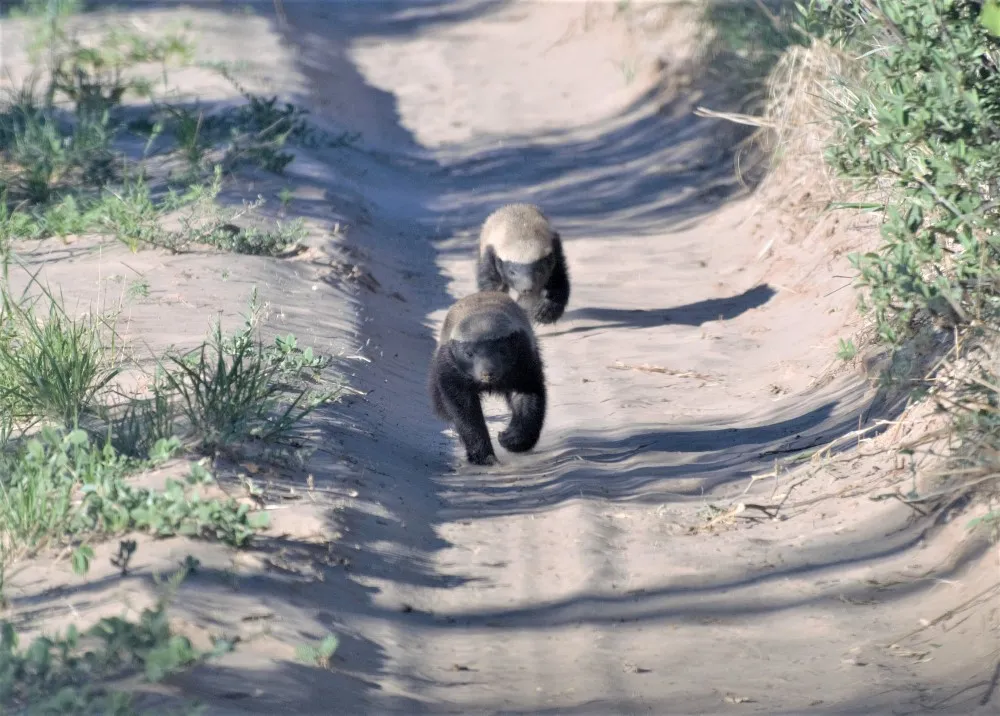Xaka camp was well positioned opposite Xaka waterhole, which I am sure would have attracted plenty of game, had it been full. As it was, the elephants broke the pump so it was dry and the area quiet, though we did see our first Gemsbok shortly before we stopped. While the stars blew our minds that night, the wind blew our tents and it was another blustery, cold and sleepless night for us all. A male lion walked past our camp roaring during night, we heard his breath thundering through his throat, he couldn’t have been more than 50m from our tents. Jackals shouted out in alarm, their piercing cries keeping us all on high alert. A bizarre dove congregation at sunrise the next morning restored the tranquility of the bush. Another big highlight was encountering two honey badgers trotting up the road towards us on our way out of camp – a very special sighting indeed.