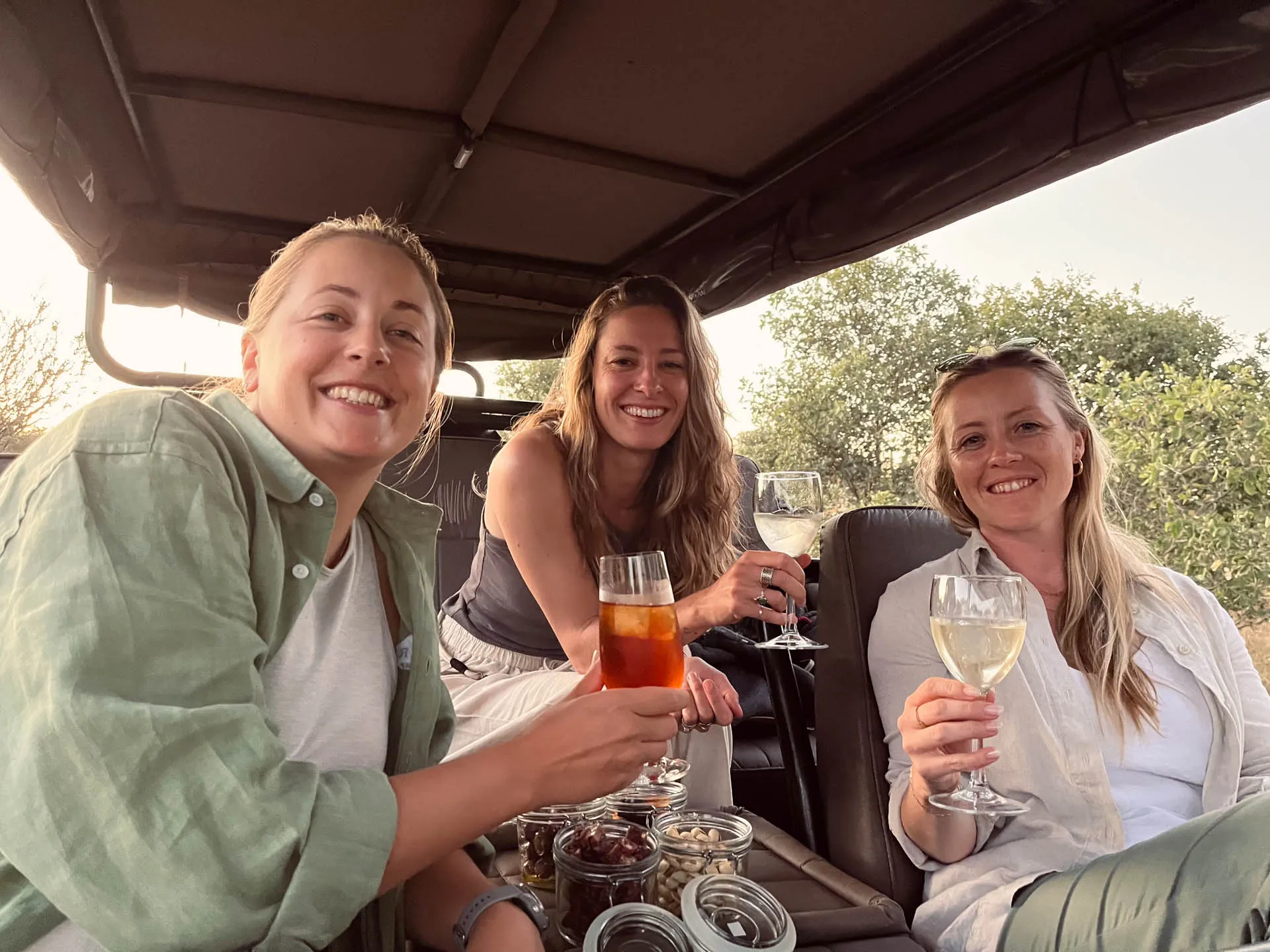 We decide to pass by and watch them for a while as they snooze. We know that as the sun sets, they might start getting active so we agree to have our sundowner in the vehicle as other vehicles are leaving. As we sip our Ataraxia Sauvignon Blanc and munch on droewors, we share stories with our guide BK and simply enjoy spending time with each other and the three male Lions lazying right next to the vehicle. As darkness sets in and ice clinks in our empty glasses, we realise these three guys aren’t planning to move anytime soon, so off we go, back to the lodge for early dinner and bed.